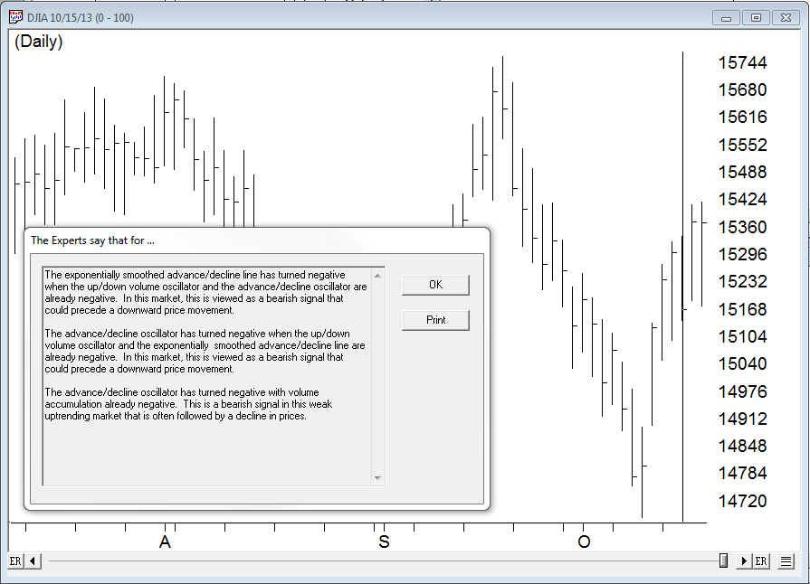 On Tuesday 10-15-2013 our AI market expert system fired a 0-100, that indicates a heavy weighting to the downside on the technical indicators. This is what the AI said