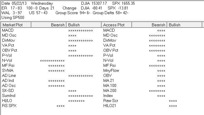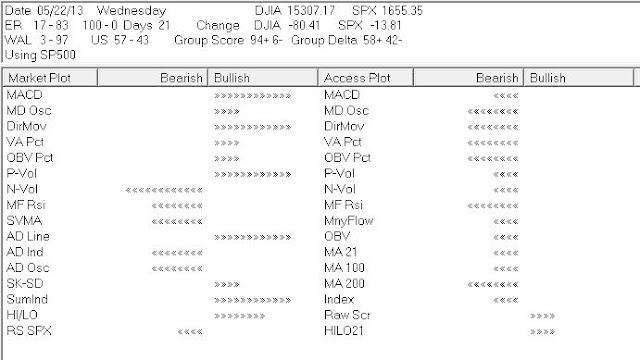 The Dow 30 Index is technically more bullish than the S & P 500 stocks. Next day Wednesday May 22nd, 2013 the Dow fell 80 some points, but the S & P 500 Index fell nearly 14 points. The market Log for 5/22/2013 shows the continued technical weakness in the stocks but less so in the Dow 30 Index.