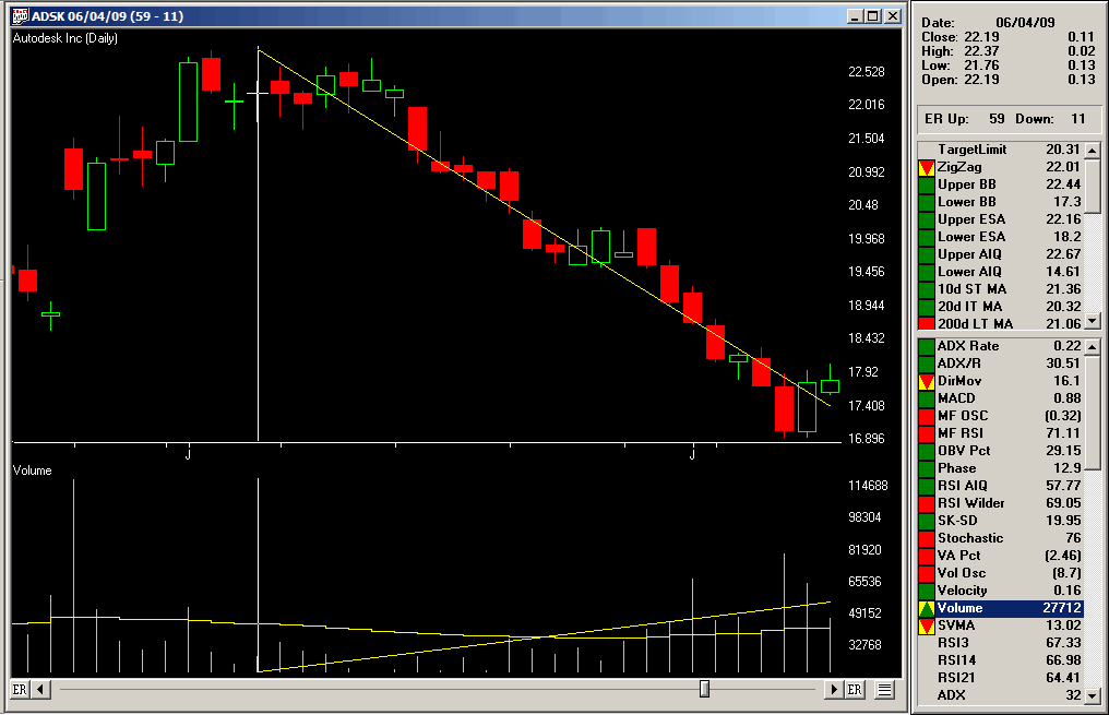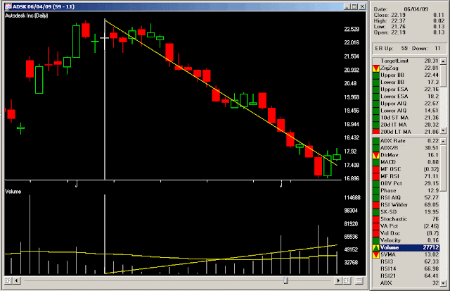 Chart of ADSK on date of positive divergence signal (7/9/09) with LR lines on price and volume.