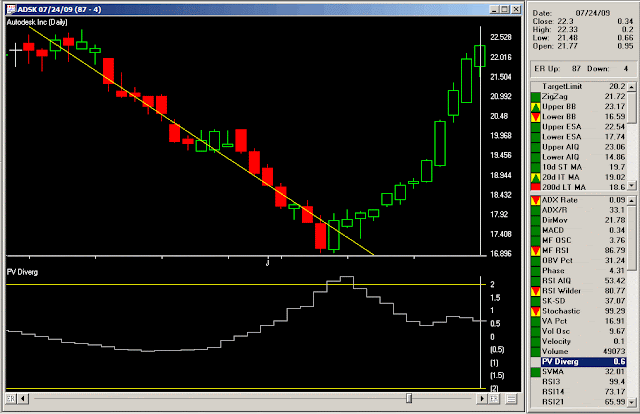 The chart of ADSK with the linear regression lines drawn in on the price and the volume. We see that price has a negative rate of change and volume has a positive rate of change. The divergence indicator exceeded the 2 STD positive level on 7/9/09 for a buy signal. Holding for 10 trading days the trade generated a profit of 23.69%.