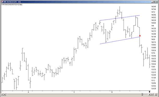 In Figure 5, I show an example of a completed H&S topping pattern with the sell signal (red down arrow). The bars after the signal indicate that this trade was immediately profitable. In Figure 2, I show an example of a completed inverse H&S bottoming pattern with a buy signal (red up arrow). The bars after the signal indicate that this trade was immediately profitable.