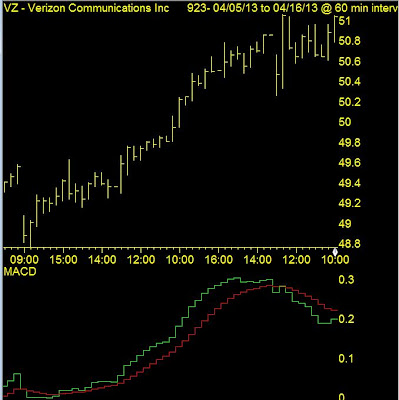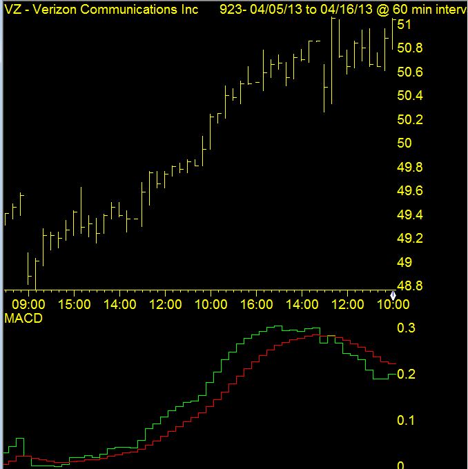 MACD divergence is a tried and tested technical tool. If you look at the daily price chart of Verizon below, you can clearly see the recent high on 4-12-2013. Note the MACD is well below the indicator peak back in the middle of March.