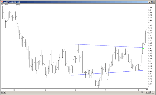I did not directly translate the code given in Siligardos’ article into AIQ EDS code because the AIQ program has chart pattern recognition built in. The code I am providing will find H&S patterns — as well as many other patterns — for either completed or emerging patterns.