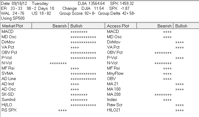 The last market Expert Rating 10 days ago was 98-2. WAL (Weighted Action List) and the US (Unconfirmed SIgnals) show a different picture. The WAL analyzes all the high up and down Expert Ratings on the S&P500 that have been confirmed by an independent indicator, in this case the Phase (MACD based). For the 500 stocks analyzed, 24% have ratings to the upside and 76% to downside.