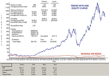To test the author’s 3x DMI system, I used the NASDAQ 100 list of stocks and AIQ’s Portfolio Manager. A long-only trading simulation was run with the following capitalization, cost, and exit settings: