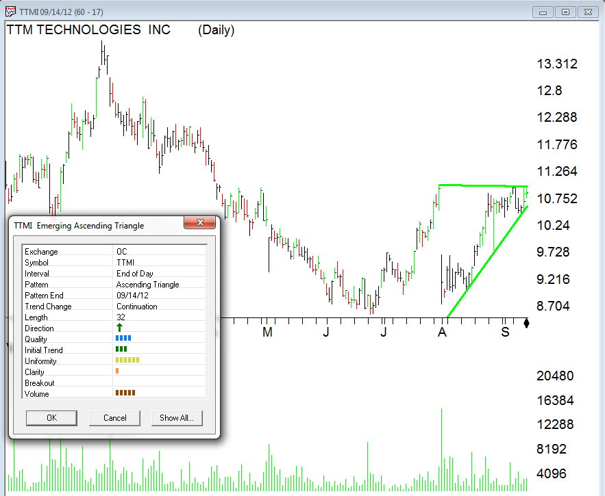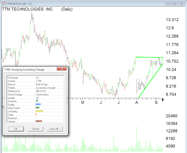 TTMI has a nice ascending triangle forming, the stock closed at 10.7 today and is still within the triangle. Diminishing volume is typical of this pattern. Breakout occurs usually to the upside through the horizontal trendline and needs to happen with good volume.