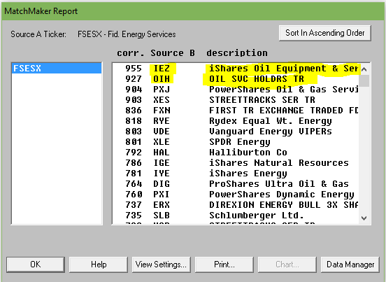 If you follow jay Kaeppel’s posts in this blog, you’ll know that he’s the master of research on all things seasonal. This past week he posted a seasonal article on energy using FSESX – Fidelity Select Energy Services. Previously he had noted the bullish tendency for ticker FSESX during the months of February, March and April. In his follow up piece, he added one more “favorable” month and then also looked at a 6-month “unfavorable” period. The article is included at the end of this post so you can see the results.As Mutual funds are not for everyone, we went in search of alternative tickers that could closely match FSESX in performance characteristics. Using WinWay Matchmaker we compared the price action of FSESX against our universe of stocks and ETFs looking for a match.