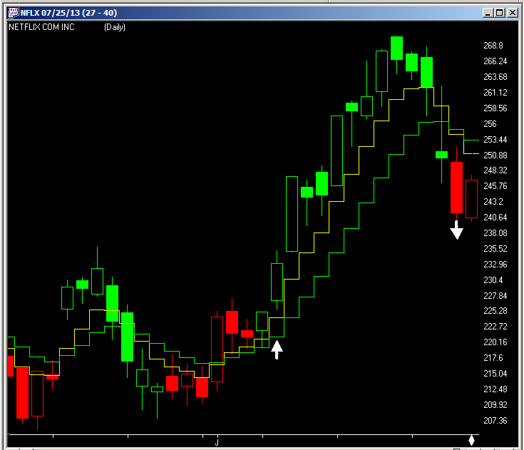 Figure 1 also shows the two moving averages typEMA in yellow and the haEMA in green. White arrows show the signal dates for the sample trade on NFLX. The entries & exits are the next day at the open. I simplified the system and did not code the stop-loss or the breakeven exits. I ran a test on the NASDAQ 100 from August 11, 2000 to August 9, 2013.