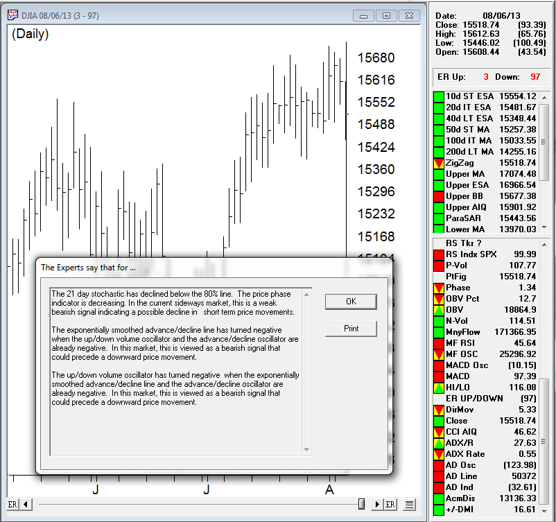 Here’s August 6th chart of the DJIA with the AIQ Experts say…