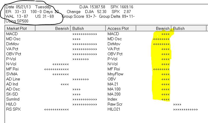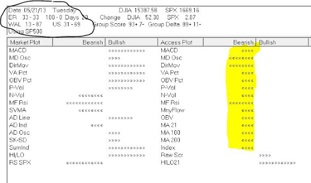 The Dow 30 Index is technically more bullish than the S & P 500 stocks. Next day Wednesday May 22nd, 2013 the Dow fell 80 some points, but the S & P 500 Index fell nearly 14 points. The market Log for 5/22/2013 shows the continued technical weakness in the stocks but less so in the Dow 30 Index.