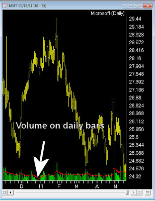 Here’s MSFT daily price bars and Volume overlaid on the price plot.