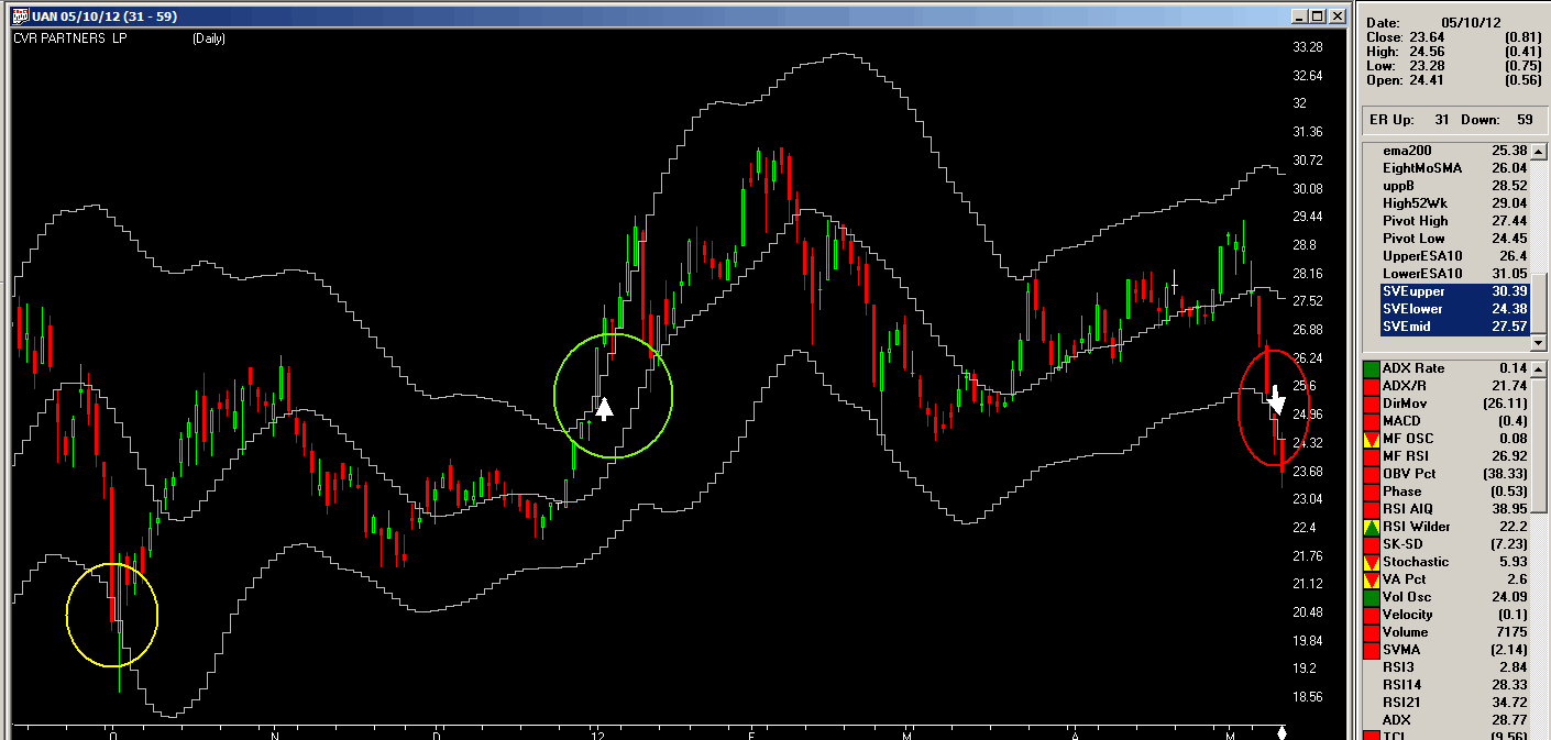 In Figure 1, I show a chart of CVR Partners LP (UAN) with the setup (yellow circle), the buy signal (green circle) and the exit (red circle). The author indicates that a valid buy signal does not occur unless the closing price has penetrated the lower band and then it closes above the upper band.